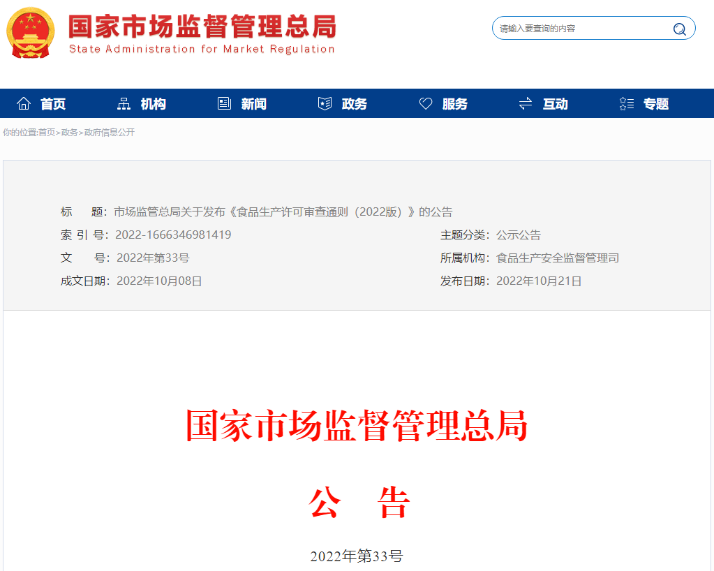 市場監管總局關于發布《食品生產許可審查通則(2022版)》的公告